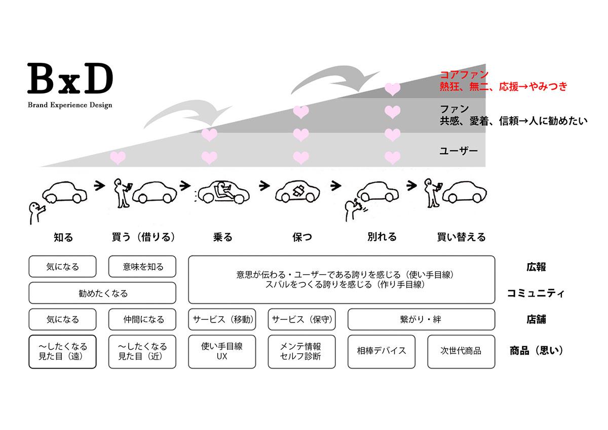 自発的にSUBARUの良さを伝えてくれる様なコアなファンを増やすことを目的にブランド体験をデザインするためのフレームワークを作成。